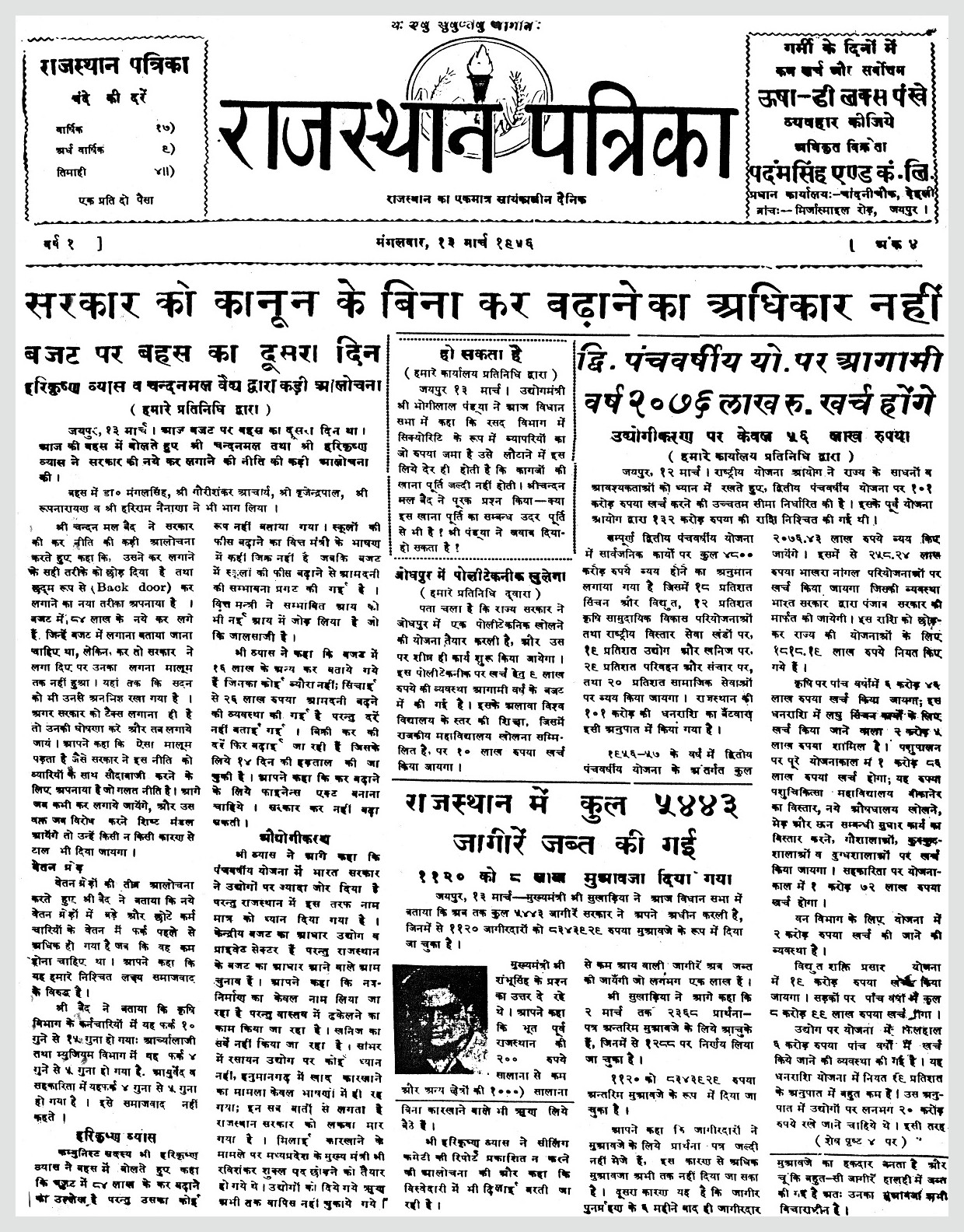 For instance, the headline of the March 13, 1956 edition read: "Government does not have the right to increase taxes without law." This was based on a discussion in the second day of the Rajasthan Government’s budget session. However, this issue was not raised by the government.