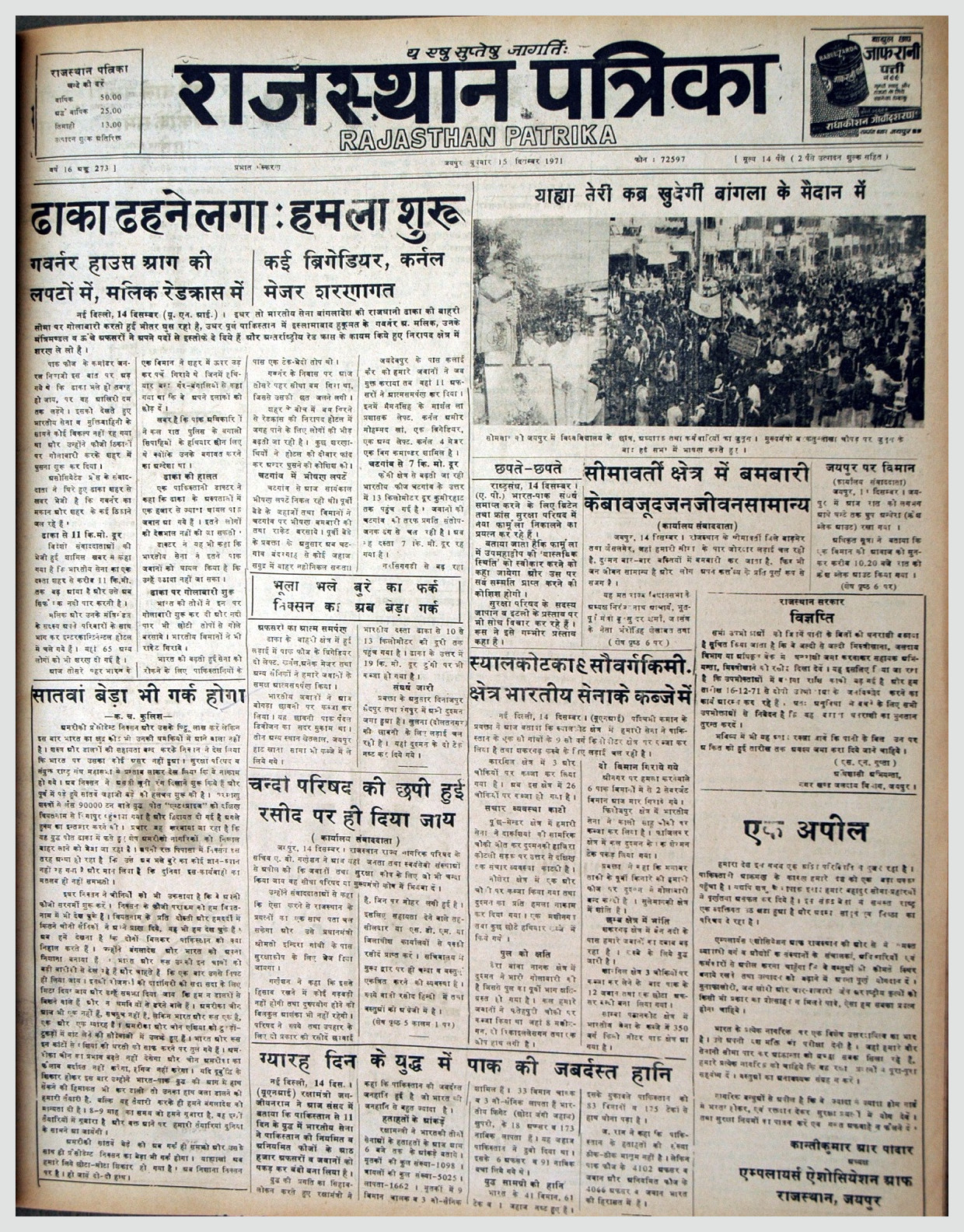 The India–Pakistan War of 1971, also known as the Third India–Pakistan War, lasted from December 3, 1971, to the surrender of Pakistan in Dhaka on December 16, 1971. The December 15, 1971 issue of the Patrika is an excellent example of its foresight, as it had already hinted at India's victory in the war. The entire front page was filled with war-related news throughout the conflict.